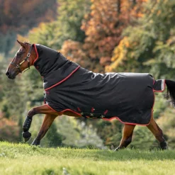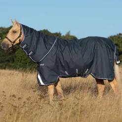 Strong 1200D polyester waterproof and breathable outer polyester lining with fibrefill in blanket and hood Classic cut, double front closures, front leg arches, hood and liner loops, cross surcingles with shine enhancing polyester lining and a detachable hood. Mediumweight turnout made from strong, waterproof and breathable 1200D polyester. Front leg arches and a detachable hood come as standard. Compatible with the Horseware Liner system.