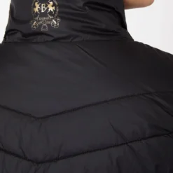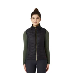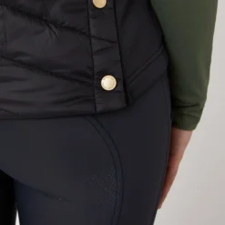 This elegant lightweight padded vest creates a beautiful feminine silhouette thanks to the stretchy waistbelt at the back. With the elegant gold details, like buttons, two-way zipper and logo on the back neck this vest is truly a must-have for the classy stable look. The zipper pockets keep small objects safely tucked away. The buttons at the back open riding slits for increased freedom of movement in the saddle.