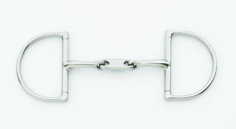 The middle link of this double jointed bit is angled relative to the bit’s side pieces, applying more pressure on the tongue.