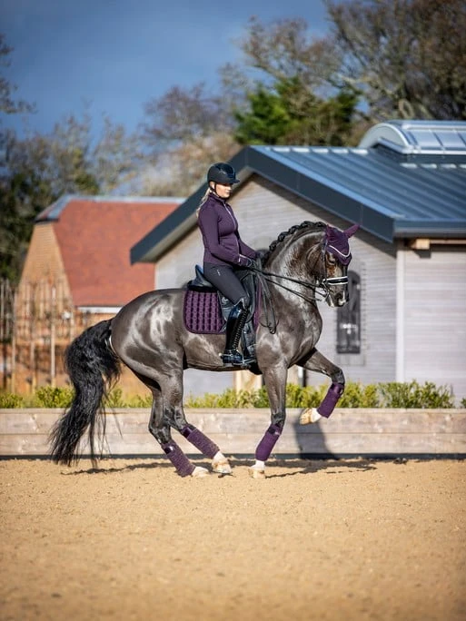 The textured PU leather girth protection area is complimented by an embossed logo and carries the usual signature LeMieux lower girth strap with its inner locking loops. The piece de resistance of the Loire Dressage Square is its unique metal badge on a leather mount in the lower back corner.
