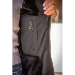 It is made of a stretch fabric on which you’ll find velvet parts on the sides and shoulders. Elegant at the stables, but also in town!