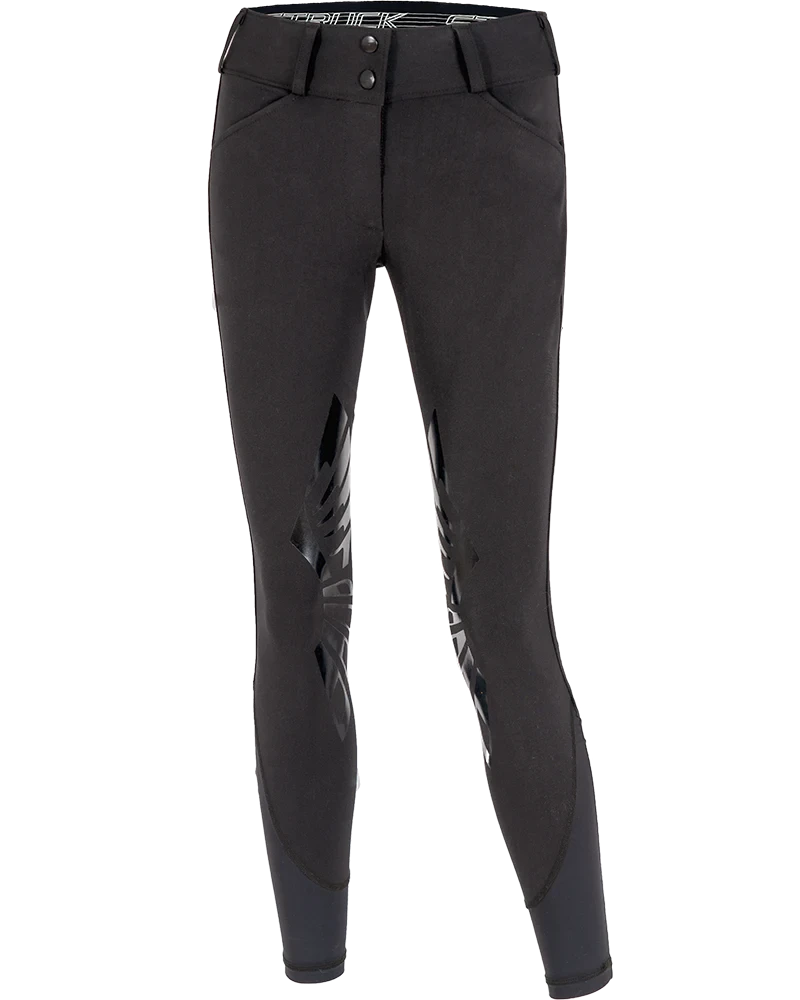 The flattering low-mid rise with custom waistband is super figure flattering, designed to keep shirts tucked-in and eliminate gapping. Our soft stretchable lower leg cuff creates a smooth and comfortable fit under your boots. Finished with our signature red sport-lock zipper, and grip knee patch system.